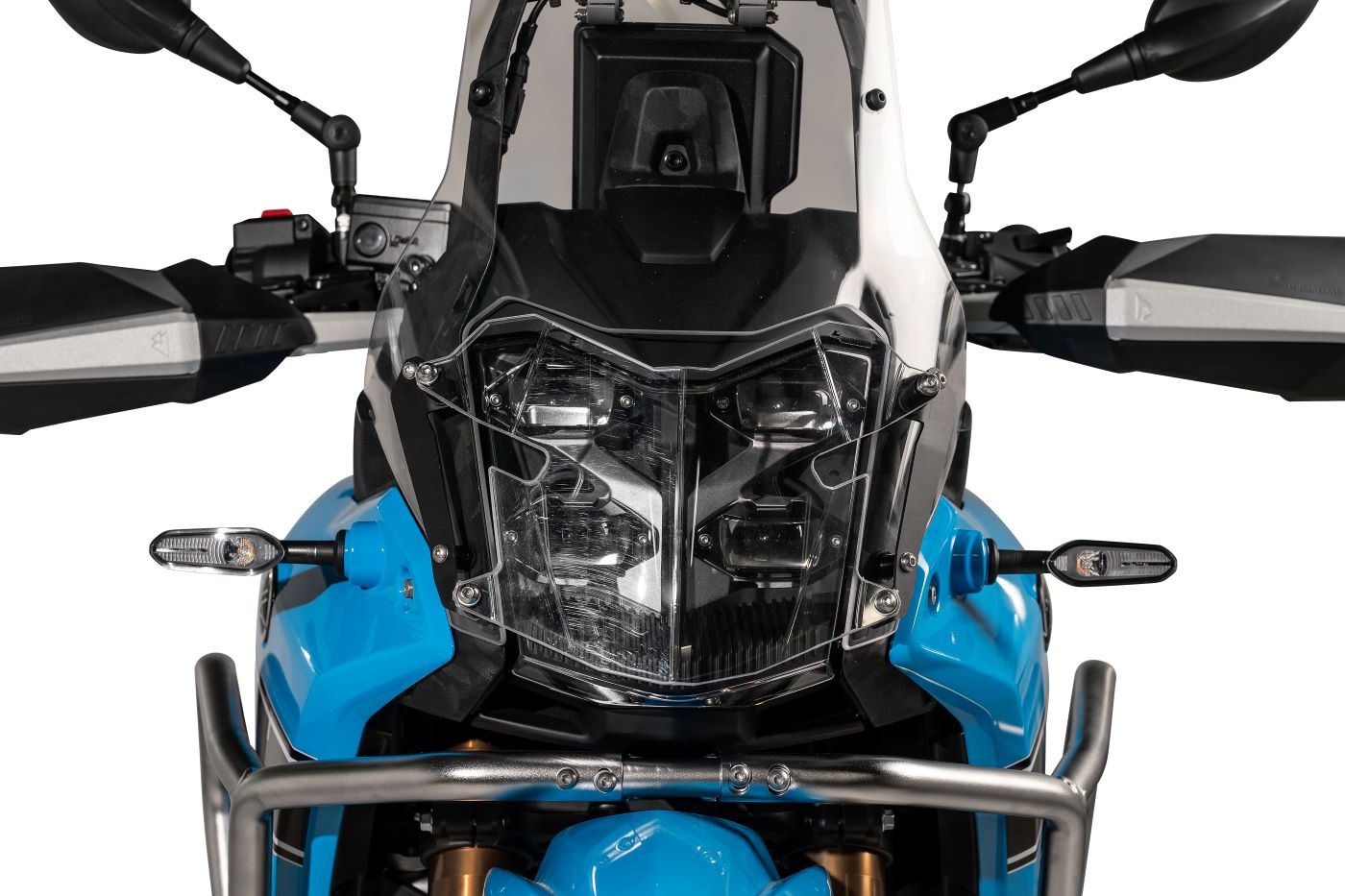 O acrílico Makrolon® da pala protetora é praticamente indestrutível e resistente a estilhaços, garantindo que o sistema de iluminação permanece intacto mesmo em condições duras. O design transparente não compromete a visibilidade da luz e mantém o estilo original da moto, enquanto o sistema de encaixe rápido (quick release) permite montar ou remover a proteção de forma rápida conforme a necessidade.